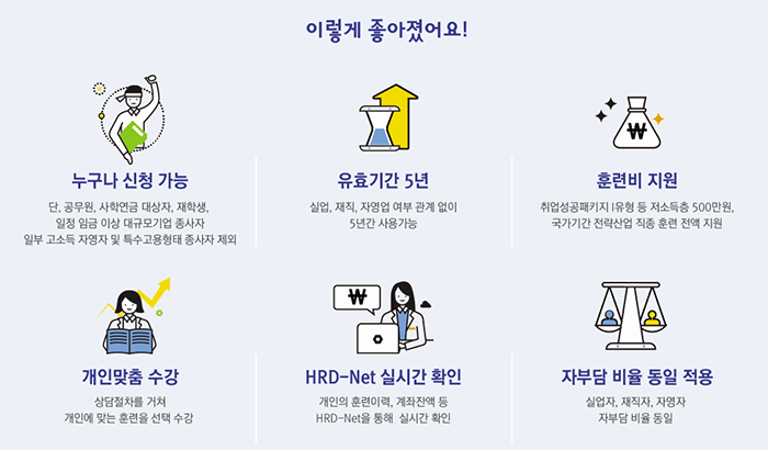 실업, 재직, 자영업 여부에 관계없이 국민내일배움카드 한장으로 5년간 사용 가능