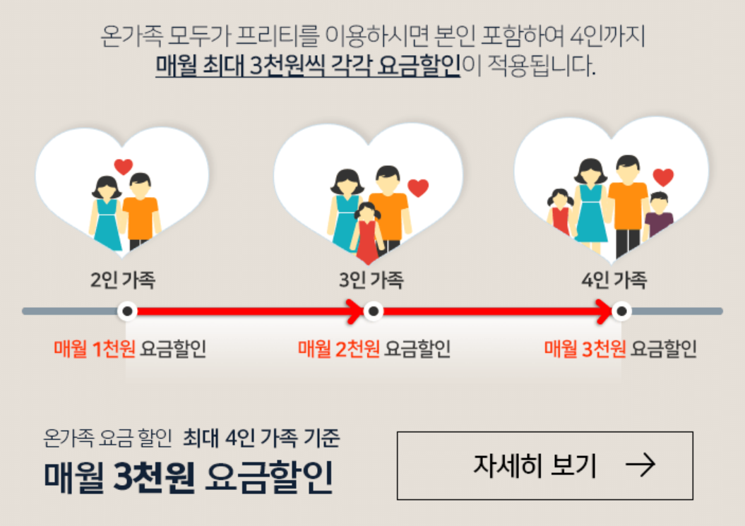 프리티 알뜰요금제도 저렴하지만 가족할인 프로모션이 있어 가족 여러 명이 사용하면 인원수별로 추가 할인이 됩니다.