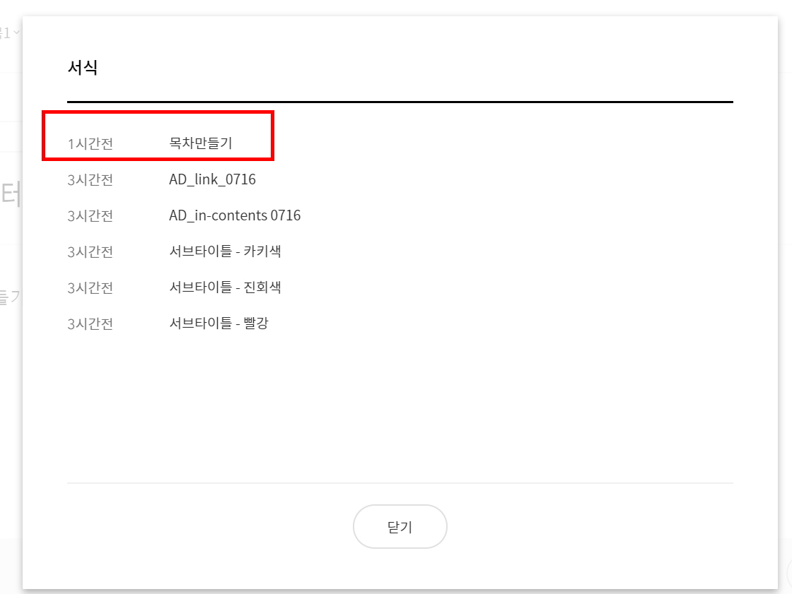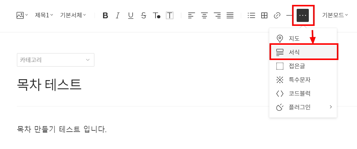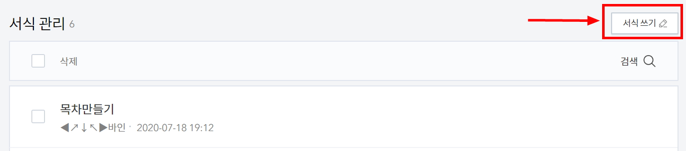 글을 쓸 때 목차가 필요하면 우측 상단에서 서식을 눌러 저장된 서식을 불러옵니다.