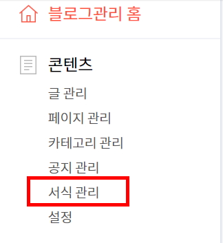 서식관리에 대한 정보는 검색을 해보세요. 중간에 설명하면 삼천포로 빠질 것 같아서 서식관리에 대한 설명은 생략하겠습니다. 아래와 같이 티스토리 관리자 메뉴 중에서 서식관리를 클릭합니다.