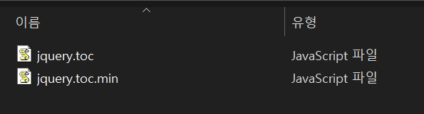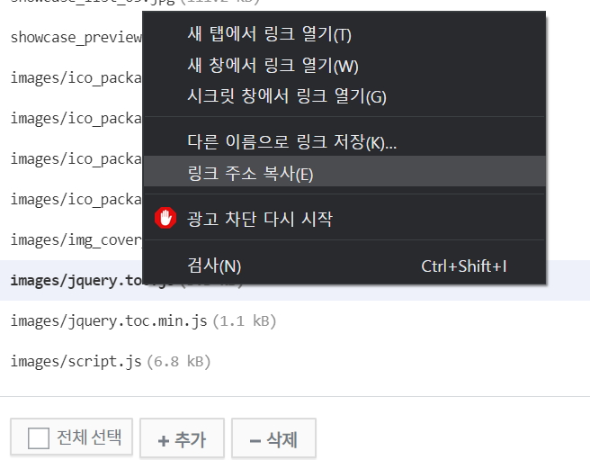업로드 한 2개 파일 중 images/jquery.toc.js라는 파일을 클릭 후 오른쪽 마우스를 누르면 링크 주소 복사라는 메뉴가 나옵니다. 즉, 파일 경로를 알아내는 과정입니다.