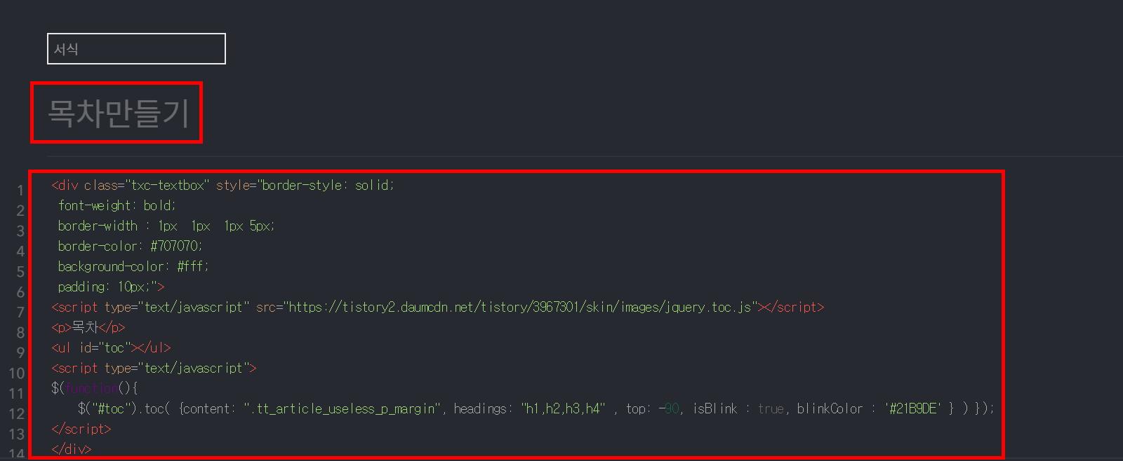 위 소스에서 <p> 목차 </p> 바로 위에 보면 https://tistory2.daumcdn.net/~~~~ 경로 보이시죠? 이것을 본인 티스토리 경로에 맞게 수정해야 합니다.