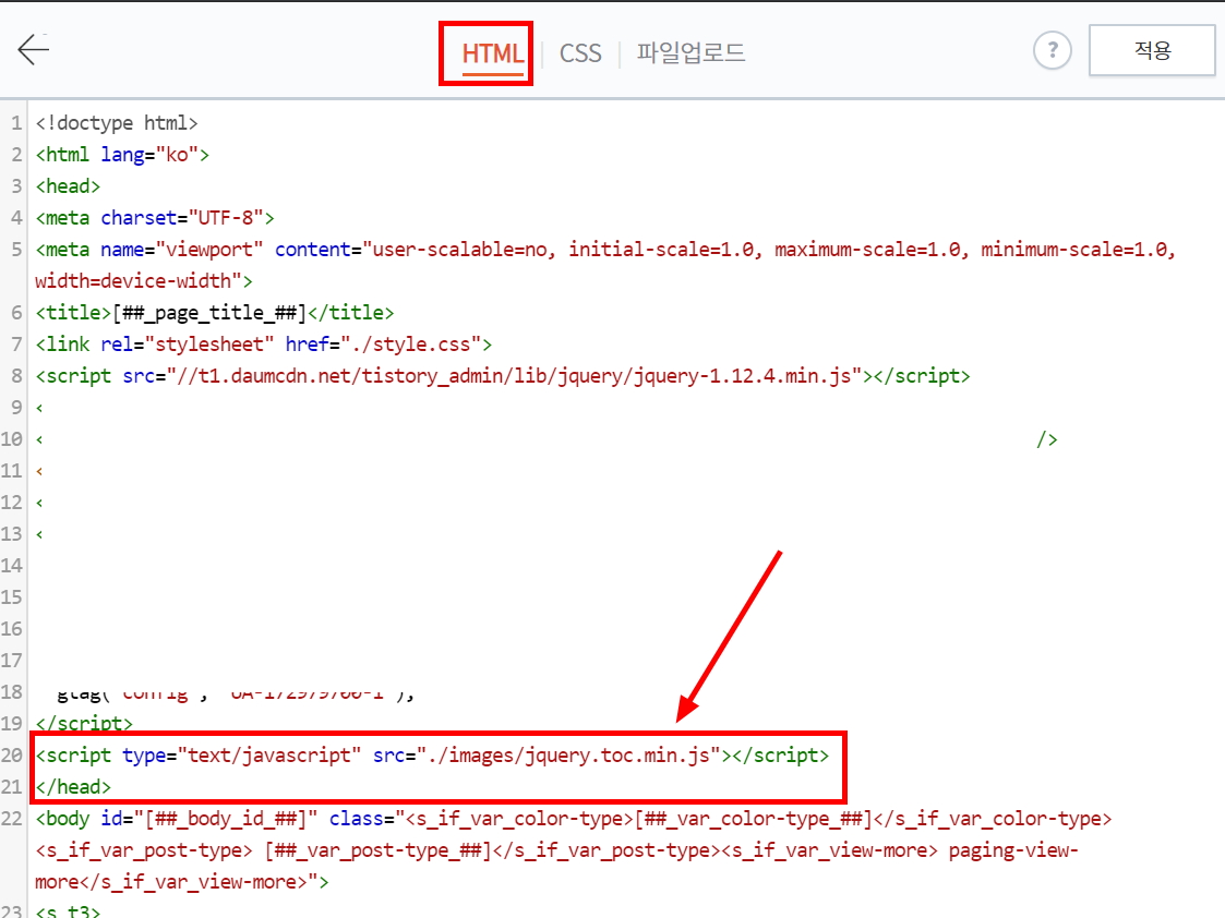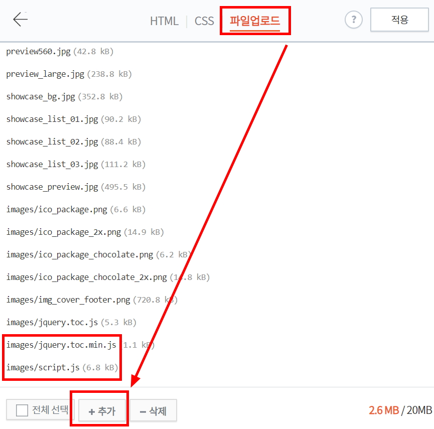 위 다운 받은 2개의 파일을 반영하고 싶은 티스토리 스킨에 업로드합니다. 방법은 아래와 같습니다.