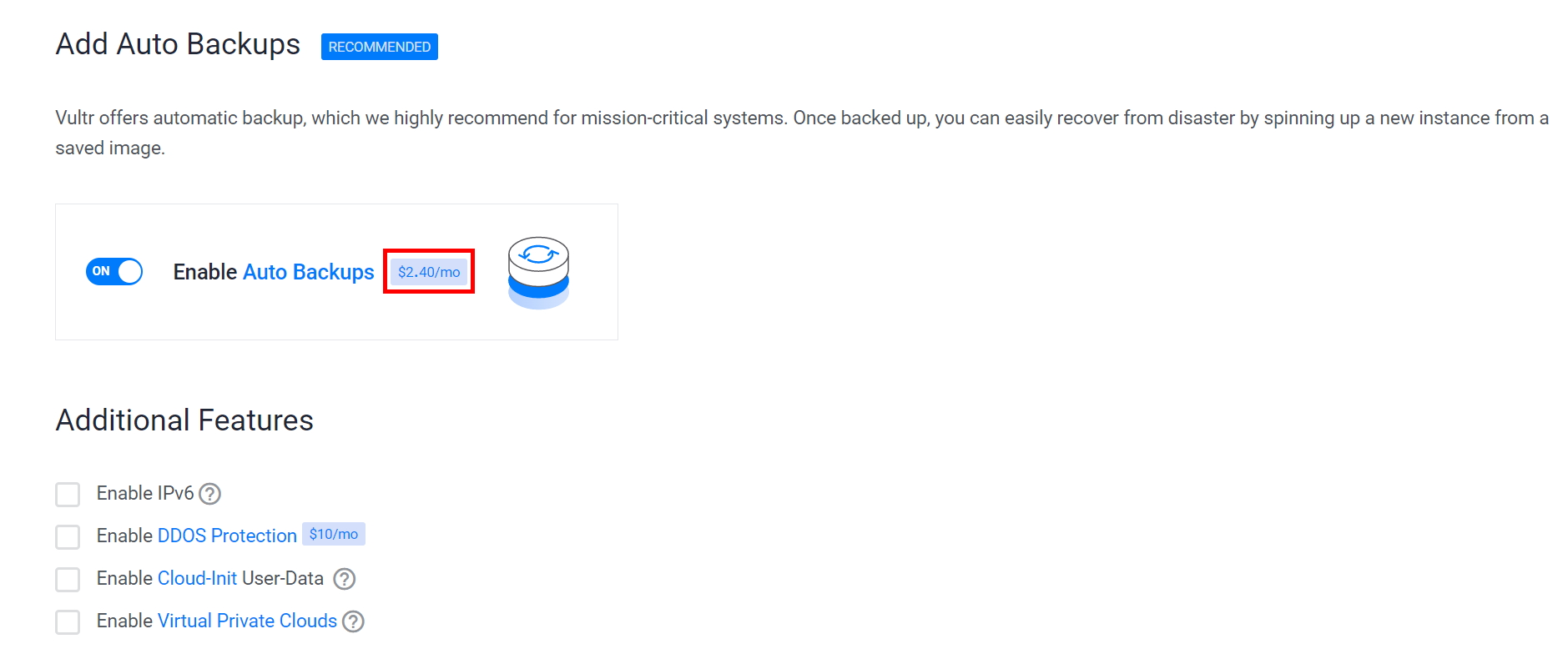 자동백업을 설정할 것인지? 고민을 했습니다. 월 $2.4를 지불해야 합니다.