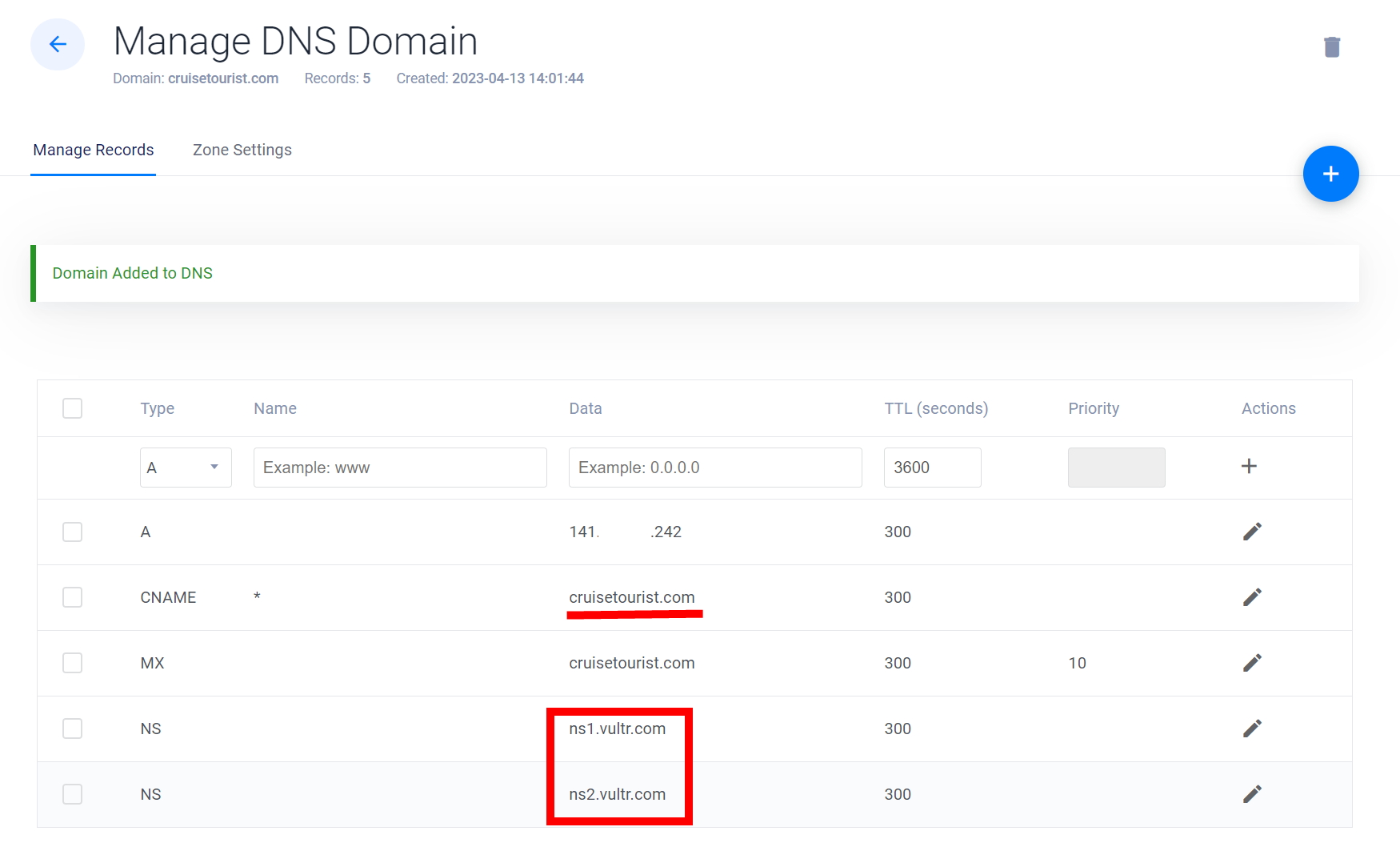 도메인이 DNS에 추가된 모습