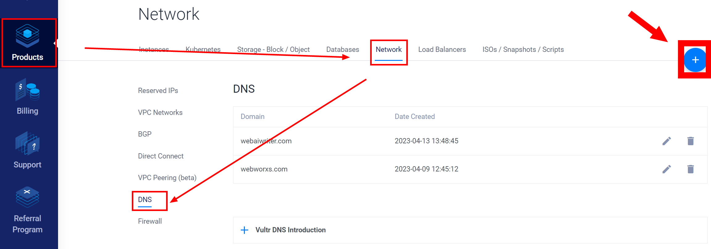 Vultr 웹서버 관리자 페이지에서 아래와 같이 Products > Network > DNS로 간 후 우측에 + 를 눌러 add domain을 선택합니해 도메인 추가를 합니다.