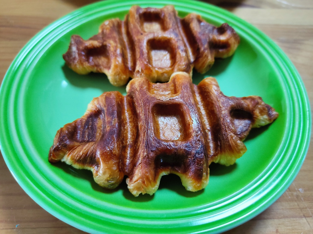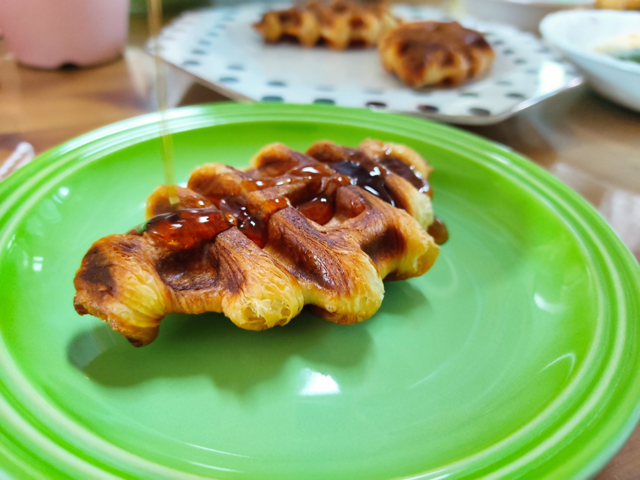 냉동실에 지난번에 넣어둔 크로와상 냉동생지가 있어서 점심때쯤 미리 해동 후 와플 기계로 구워서 줬습니다.