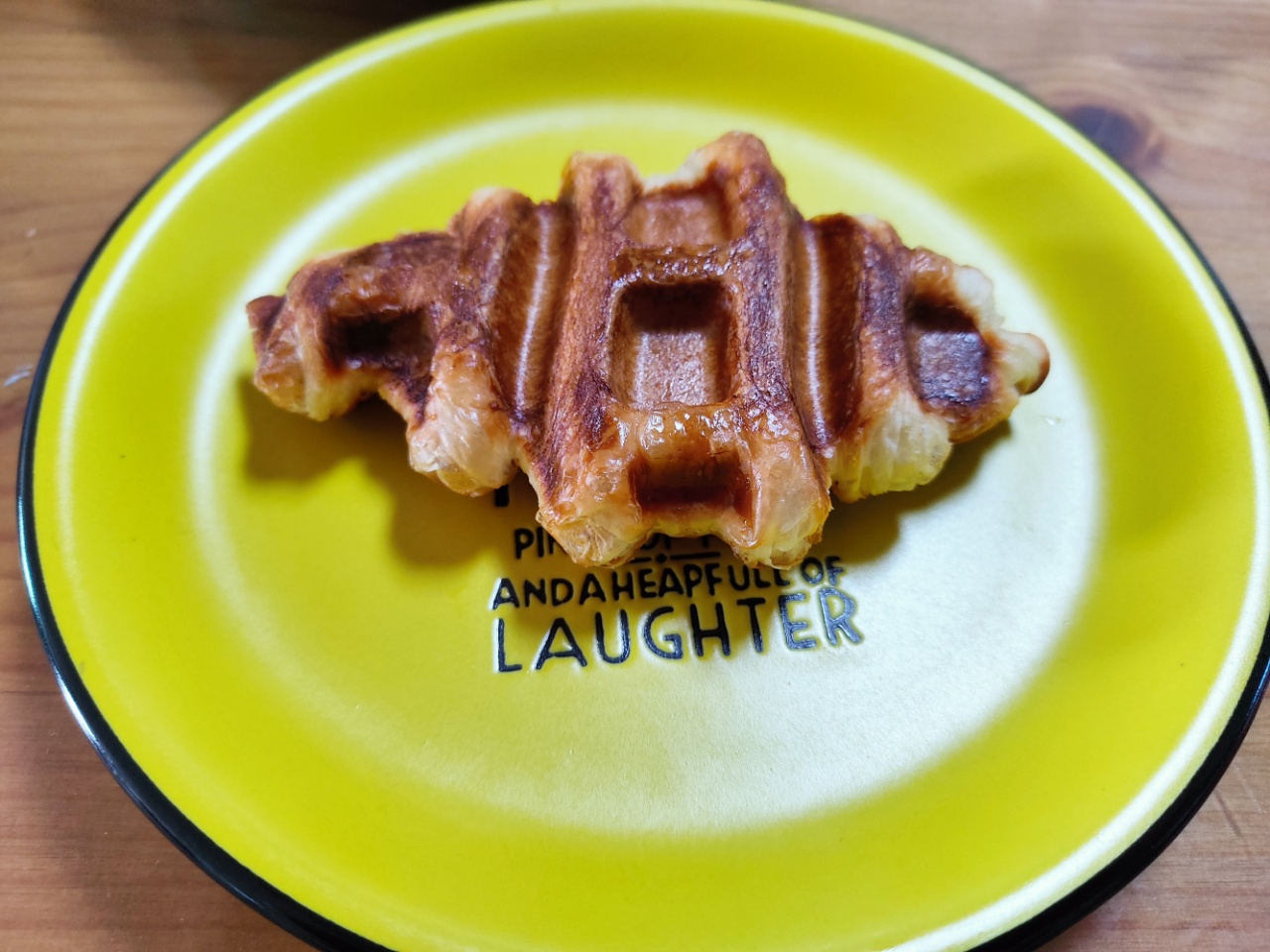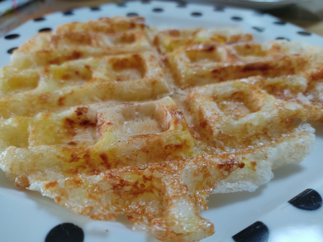 와플 기계에 쩍 달라붙게 되어 망쳤다고 생각했는데 열을 더 가해주고 바싹 구우니까 잘 떨어져서 성공했습니다.
